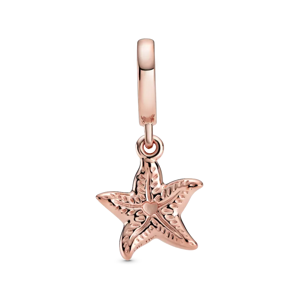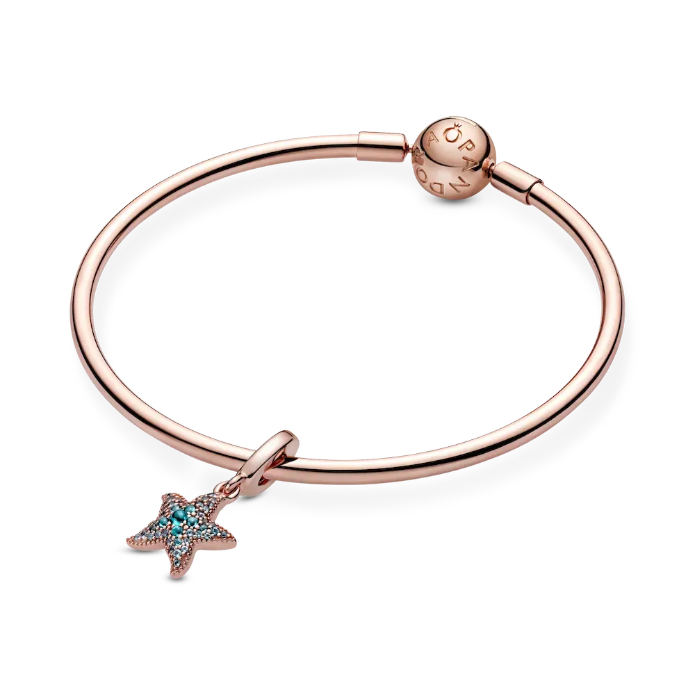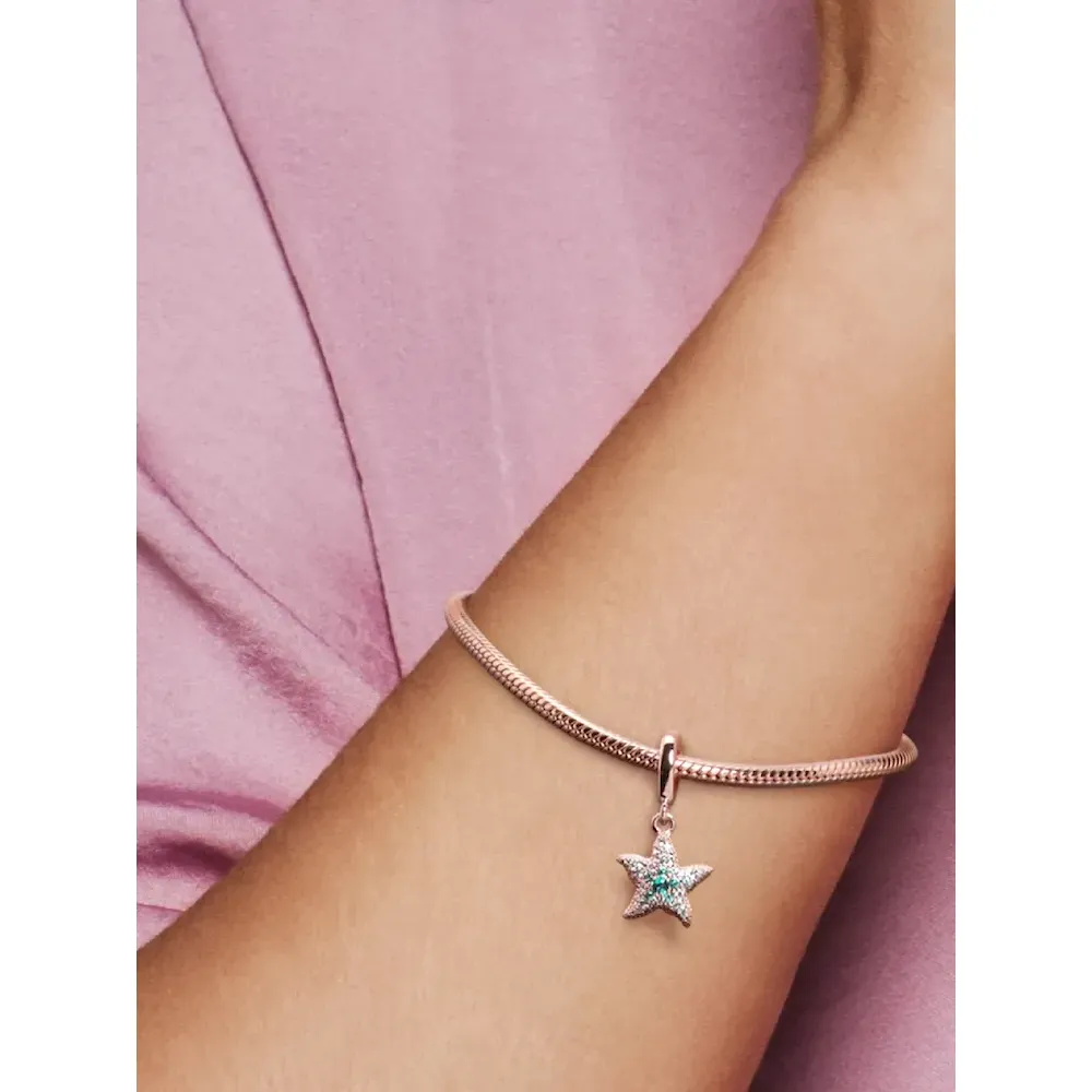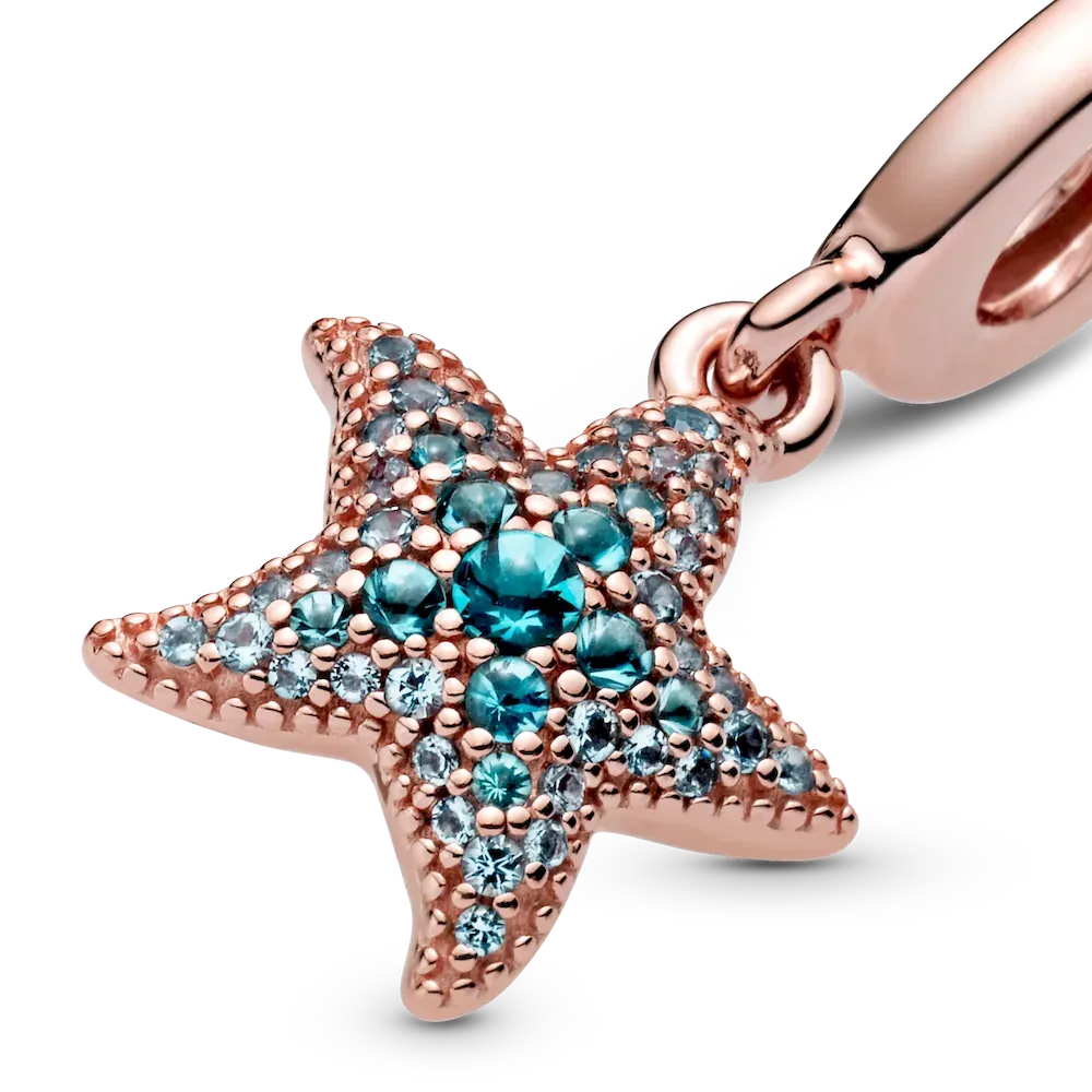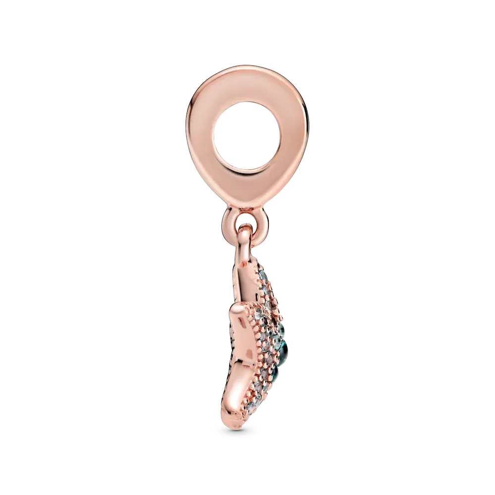Inspired by the creatures of the deep blue sea, this Sparkling Starfish Dangle Charm adds sparkle to any outfit. The 14k rose gold-plated starfish charm is hand-finished and set with sparkling and beaded details. Icy blue crystals and icy green crystals with beads between them add a gradient of shine as the colours shade from blue to green. Wear the starfish charm as a complement to any beach-themed outfit or as a reminder that the beach is only a daydream away.