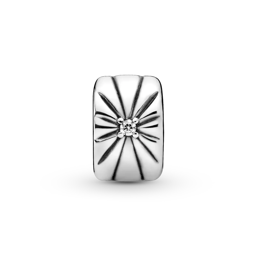 You can always have a bright ray of sunshine to light your path thanks to this Sparkling Sunburst Clip Charm. Two bead-set stones form the center of the sunburst and serve as the focal point for the charm, whose elegance is marked by its deceptive simplicity that adds just the right touch of sparkle. Wear the silver charm by itself or pair it with other charms to create a unique look that will light your way for many years to come. This clip charm features no silicone grip, so it will slide if not styled onto threads (two raised charm dividers).