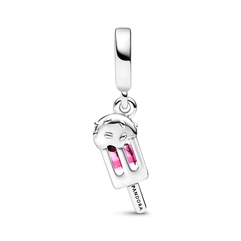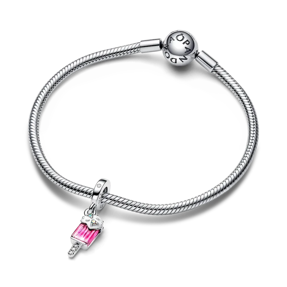 A sweet treat for the one who has your heart. Gift a trip to candy land with the Sprinkled Popsicle Dangle Charm, inspired by a universe of pop-art and saturated colours. This sterling silver dangle charm features a popsicle with gradient pink Murano glass and hand-applied white enamel frosting. The frosting is decorated with raised polished sprinkles and set with two Aurora Borealis cubic zirconia stones, shimmering with clear, pink and blue tones depending on how the light hits. A row of pavé on the popsicle stick adds a touch of sparkle to this playful, modern Pandora jewellery piece.