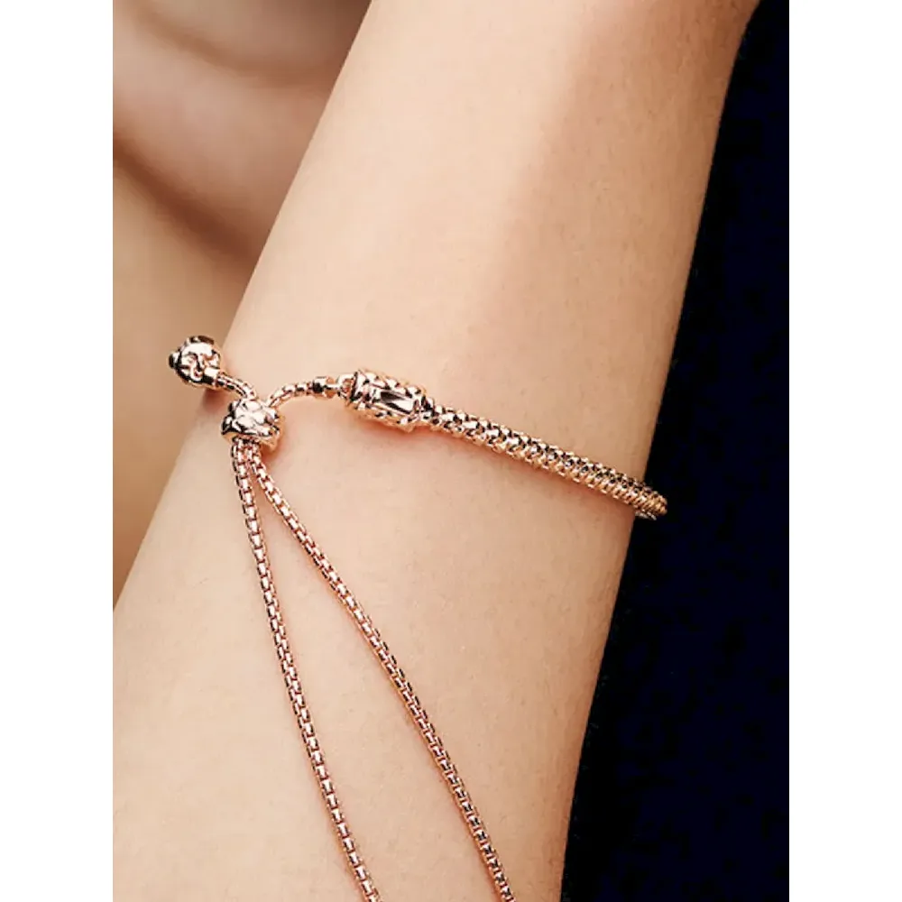 Our Studded Chain Slider Bracelet is the ultimate versatile carrier, adjustable to any length thanks to its slider clasp. Crafted in 14k rose gold plating, one size fits all. The bracelet has a flexible core for easy movement, while its sliding silicone ball on the slimmer chain allows for size adjustment, so you can find your perfect fit every time. Customize yours with up to 10 charms or dangle charms of your choice to make it extra personal.