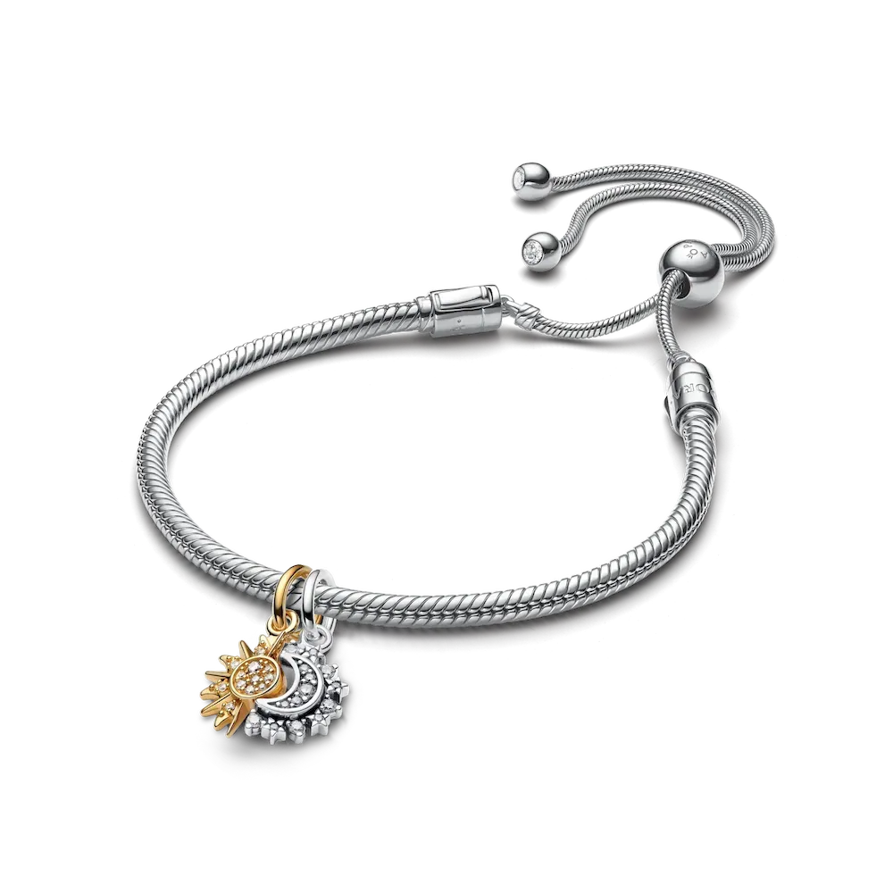 Sun and moon charm in sterling silver and 14K gold-plating. Two halves in perfect harmony, made to be shared with someone who completes you.