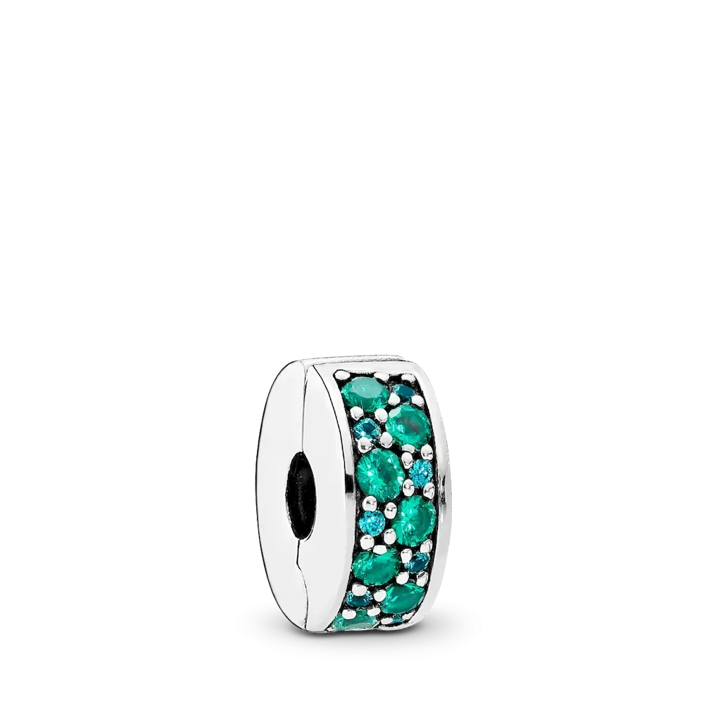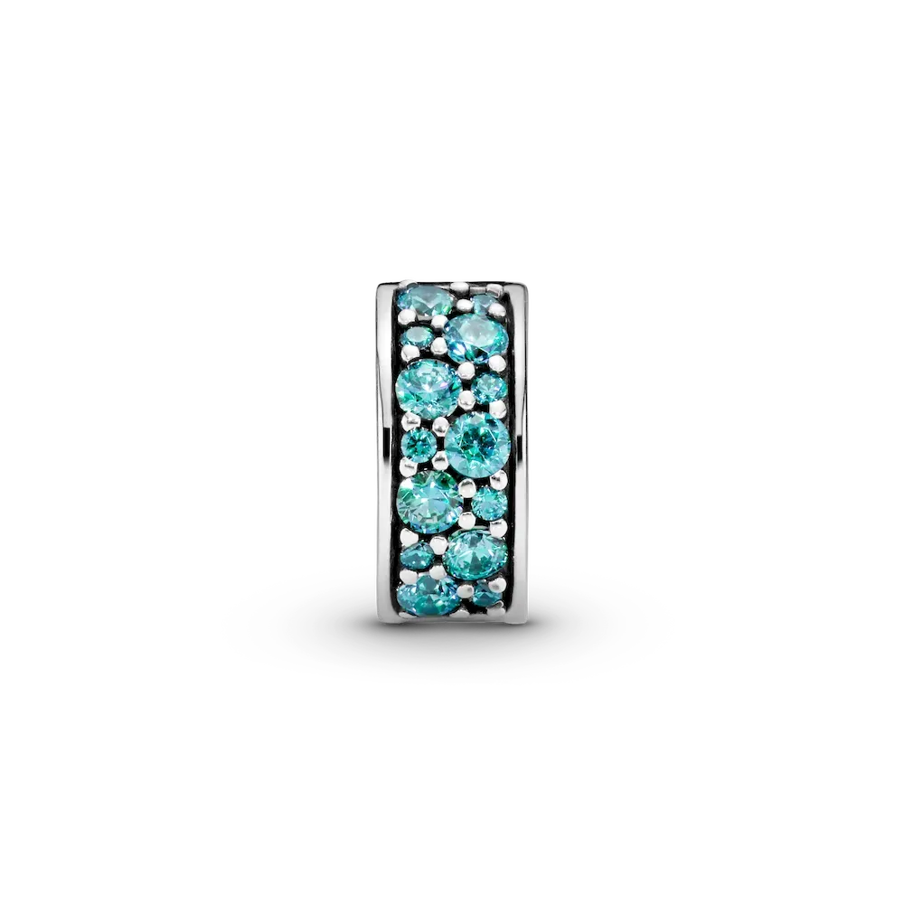 Add balance and beauty to your bracelet with our sterling silver clip charm, hand-finished for a human touch. It’s been lovingly pavé-set with teal-colored cubic zirconia that lend subtle sparkle to your look. Clip multiples onto your Pandora Moments bracelet to create a symmetrical styling. Or just add one. Your mood sets the tone. This clip charm features a silicone grip, does not fit onto threads (two raised charm dividers.) This charm can be styled anywhere else on the bracelet.