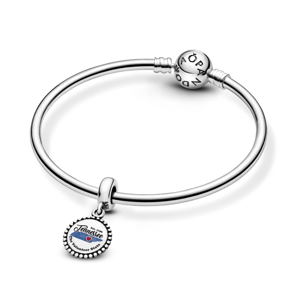 Southern grace, Tennessee charm in every detail. This sterling silver dangle features a state-shaped silhouette in glossy blue enamel, a small red heart, and “Tennessee” beautifully scripted across in black. Wherever the country road leads, take a piece of the Volunteer State along for the ride.