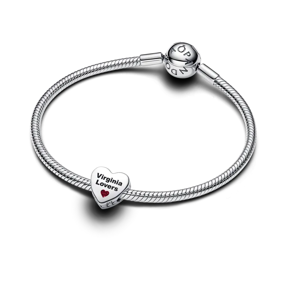 Virginia’s breathtaking countryside comes to life on this heart-shaped charm in sterling silver. One side captures the beauty of rolling hills, clear blue skies, and blooming dogwood flowers in glossy enamel. On the other side features “Virginia Lovers” in black lettering with a lovely red heart underneath. Wear your love on a stylish charm, pictured with the place you call home.