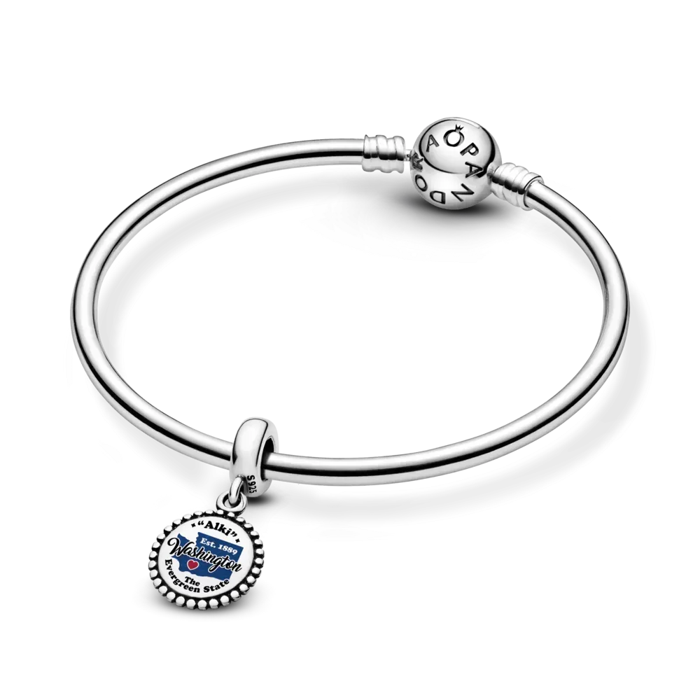Perfect for showing your love for Washington, this sterling silver dangle charm proudly displays the state’s symbolic motto “Alki” above and its popular nickname “The Evergreen State” below. The design also features a state-shaped silhouette in glossy blue enamel, accented with a red heart, and “Washington” elegantly scripted across.