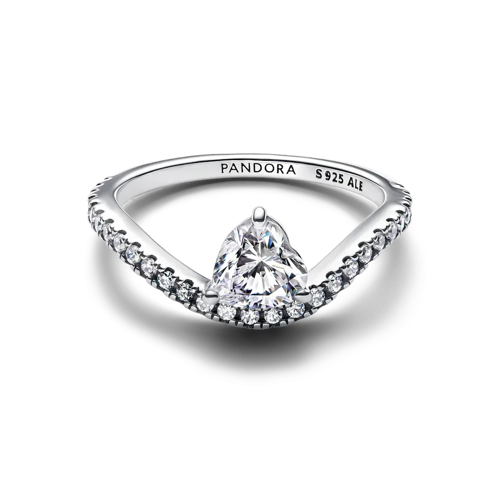 A wavy band combines with a heart-shaped stone in this unique ring design. Crafted from sterling silver, it showcases a prong-set heart-cut cubic zirconia offset from a sparkling pavé band. A contemporary piece with an elegant, flowing design, it will pair perfectly with your favorite sterling silver jewelry.